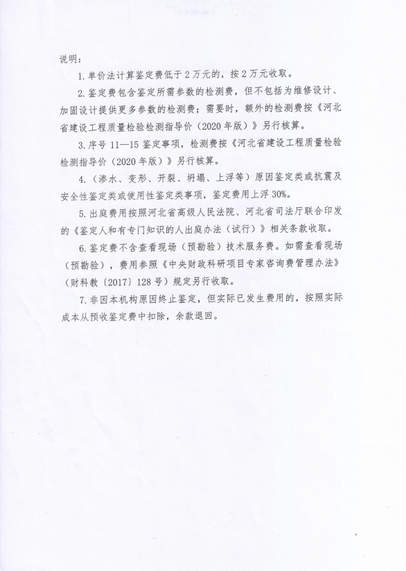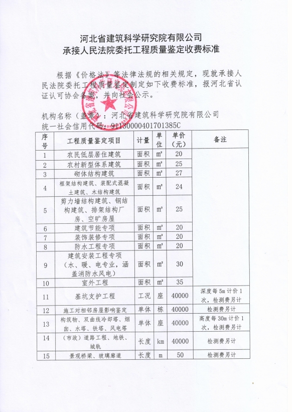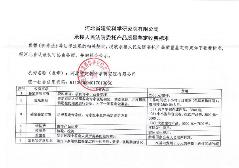 根據(jù)《河北省認(rèn)證認(rèn)可協(xié)會產(chǎn)品質(zhì)量鑒定管理辦法(試行)》第36條、《河北省認(rèn)證認(rèn)可協(xié)會工程質(zhì)量鑒定管理辦法(試行)》第35條“目前國家物價(jià)管理部門未對工程質(zhì)量鑒定收費(fèi)進(jìn)行統(tǒng)一定價(jià),鑒定機(jī)構(gòu)應(yīng)當(dāng)公示本機(jī)構(gòu)收費(fèi)標(biāo)準(zhǔn)”之規(guī)定,我公司參照財(cái)政部財(cái)科教【2017】128號《中央財(cái)政科研項(xiàng)目專家咨詢費(fèi)管理辦法》中的有關(guān)規(guī)定,并結(jié)合我公司產(chǎn)品質(zhì)量鑒定和工程質(zhì)量鑒定中鑒定專家工作的實(shí)際情況,制定了《河北省建筑科學(xué)研究院有限公司產(chǎn)品質(zhì)量鑒定/工程質(zhì)量鑒定收費(fèi)標(biāo)準(zhǔn)》(見附件)?,F(xiàn)予以公示。